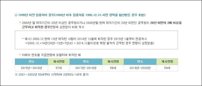 1995년 이전의 임용자의 경우 자세한 내용은 위를 참고해주시면 될거 같은데요. 2015년~2016년은 57세 2017년~2018년은 58세로 점점 개시연령이 늘어나고 있습니다.