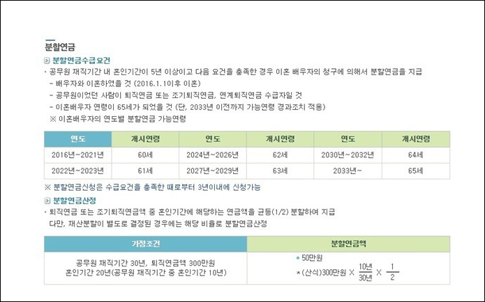 공무원 재직기간 내 혼인기간이 5년 이상이며 위 요건을 충족한 경우에는 이혼한 배우자의 청구에 의해 분할이 가능하다는 점 위를 참고해주시면 될거 같네요. 이상으로 공무원연금 수령시기에 대해서 알아보았습니다. 감사합니다.