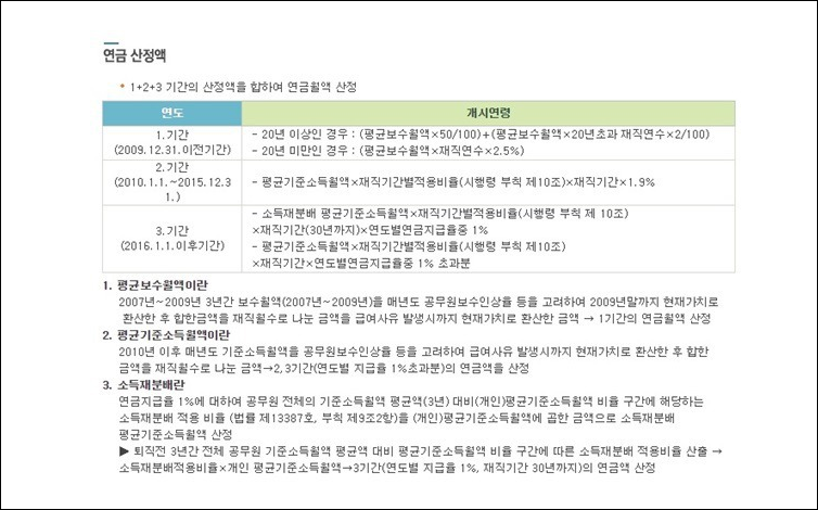 그렇다면 연금은 과연 얼마를 받을 수 있을까요. 연금 산정액으로 일을 한 기간이 20년 이상인지 20년 미만인지로 계산이 달라집니다. 또한 연금은 분할로 수급이 가능합니다.