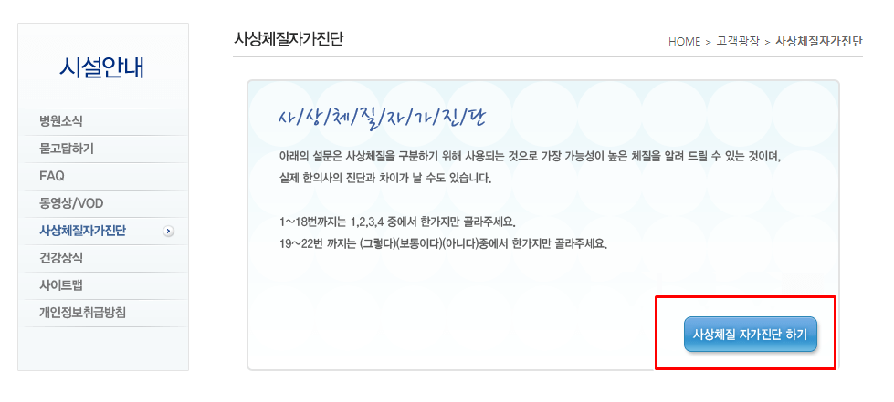 우측 상단 메뉴 중에서 고객광장 메뉴에 커서를 가져가 보면 사상체질자가진단 이라는 메뉴를 찾아서 들어가주시면 됩니다.