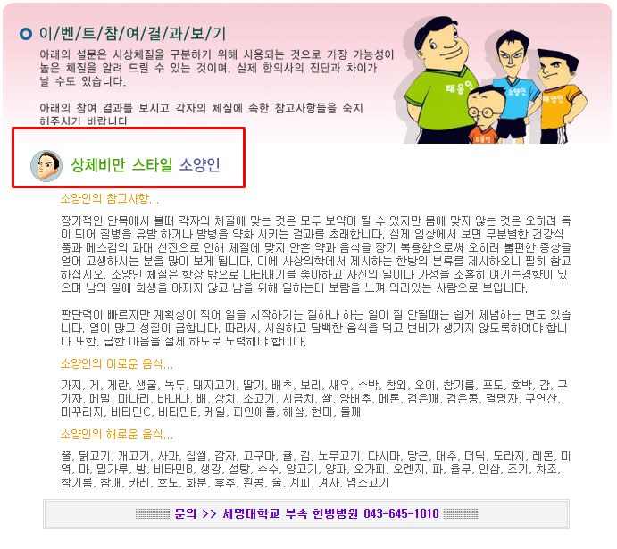 설문조사를 통해 감별되는 사상체질을 볼 수 있게됩니다. 본인이 어떤 체질을 가지고 있는지 궁금하다면 세명대학교 부속 한방병원 홈페이지에서 알아볼 수 있습니다.