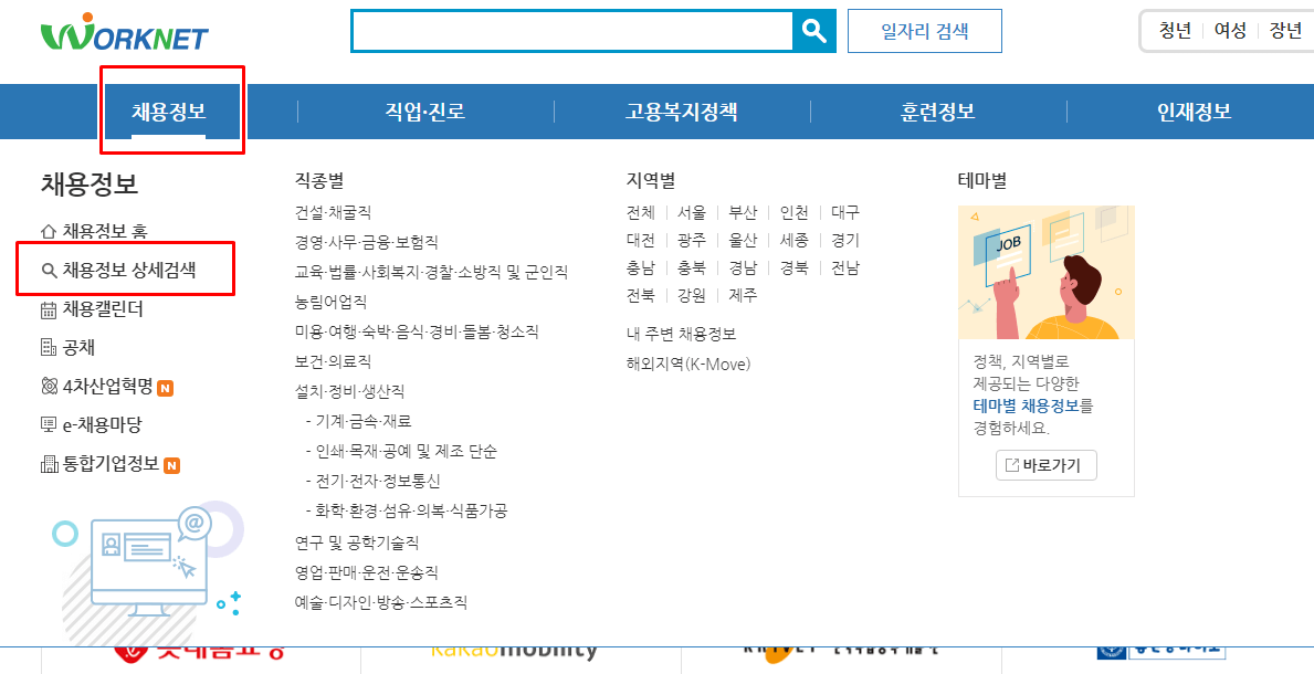 상단 메뉴들을 볼 수 있습니다. 먼저 채용정보 메뉴입니다. 클릭을 하면 밑에 소메뉴들이 뜨는데요. 근무지역별, 기업형태별, 직종별 등 찾고자 하는 종류를 선택해주세요.
