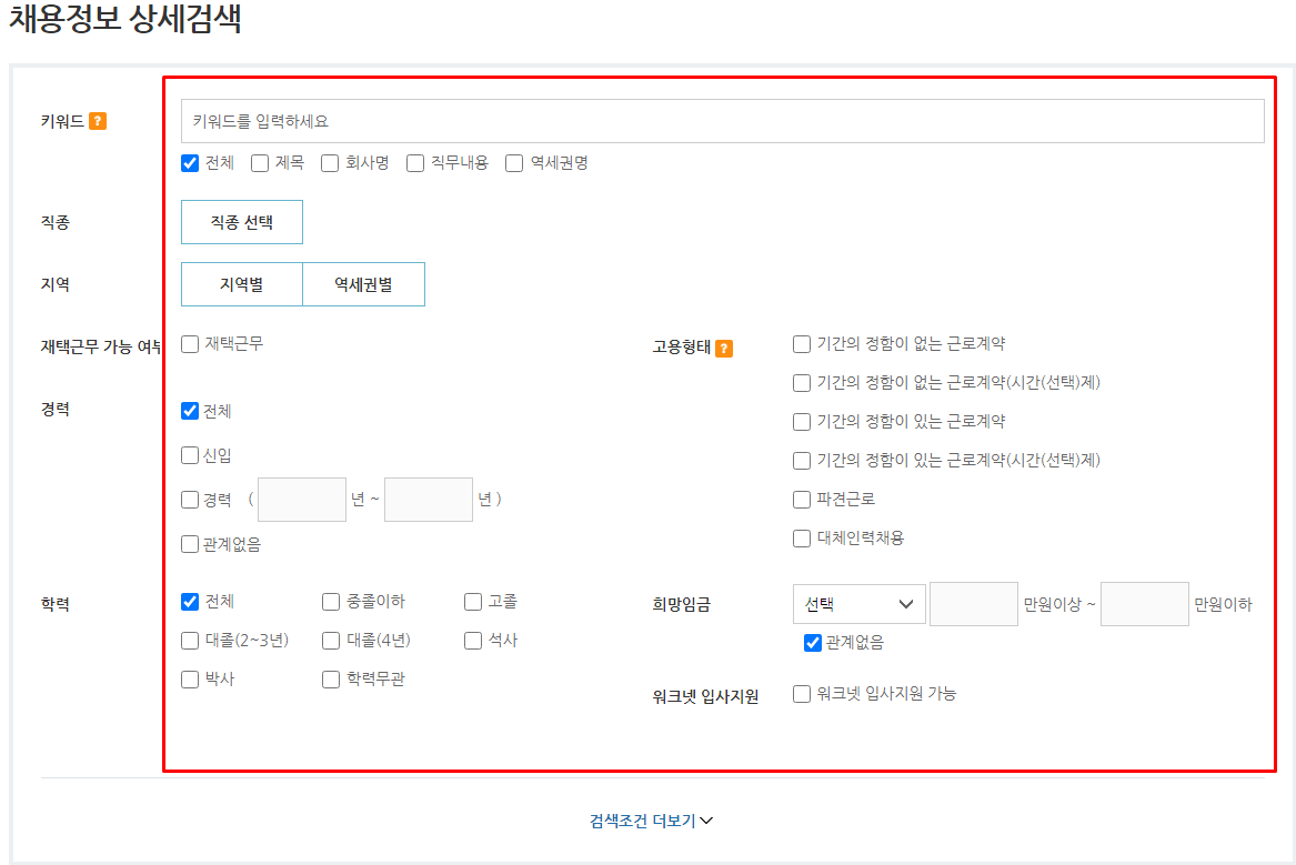 거기다 일자리 키워드와 근무지역, 희망직종 등 검색을 통해서도 상세하게 검색할 수 있습니다. 정보를 상세히 입력할 수록 보다 확실한 구인구직을 확인할 수 있는데요.