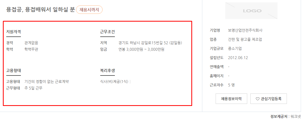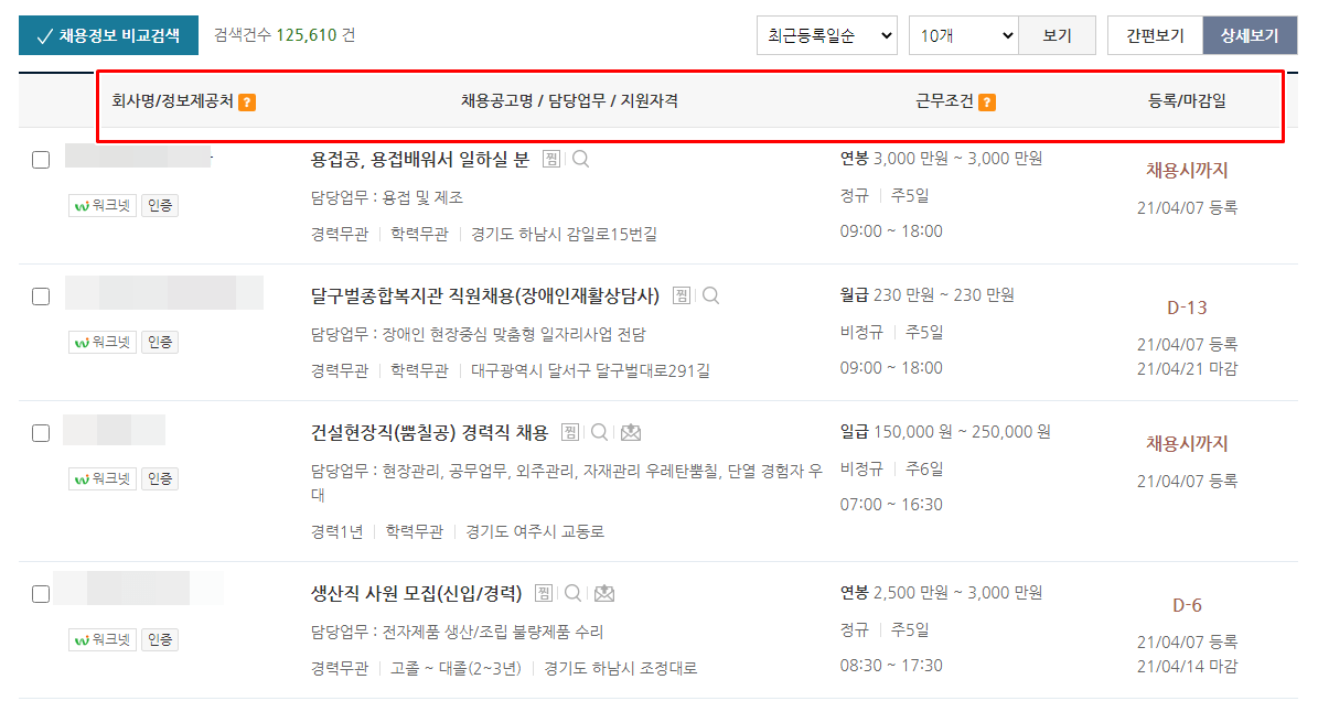 워크넷 구인구직에서 검색 후에는 위 이미지와 같이 목록들을 볼 수 있습니다. 간략한 정보들은 목록에서도 확인할 수 있는데 보다 자세한 내용을 보고 싶다면 선택해서 들어가주시면 됩니다.