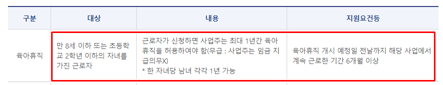 육아휴직에 관한 기본적인 설명을 먼저 알려드릴게요. 만 8세 이하 또는 초등학교 2학년 이하의 자녀를 가진 근로자가 해당되고요.