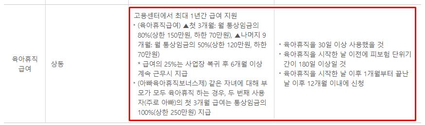 육아휴직 급여의 지급액의 경우 통상임금의 첫 3개월: 월 통상임금의 80%(상한 150만원, 하한 70만원), ▲나머지 9개월: 월 통상임금의 50%(상한 120만원, 하한 70만원) * 급여의 25%는 사업장 복귀 후 6개월 이상 계속 근무시 지급 받을 수 있습니다.