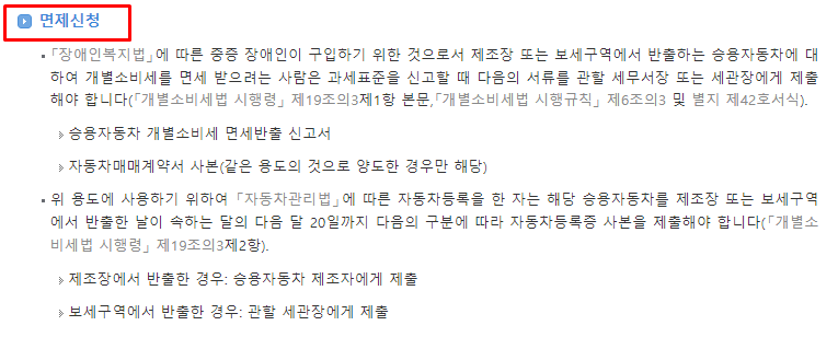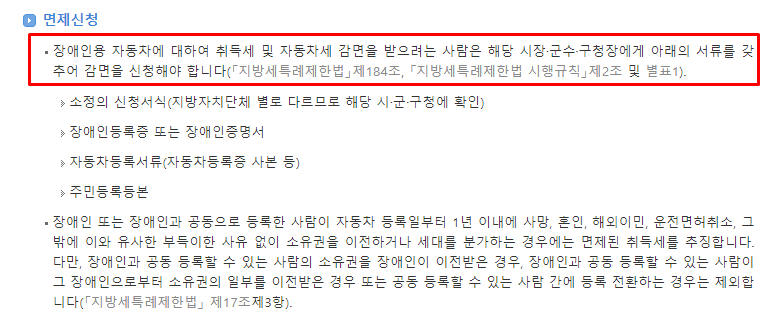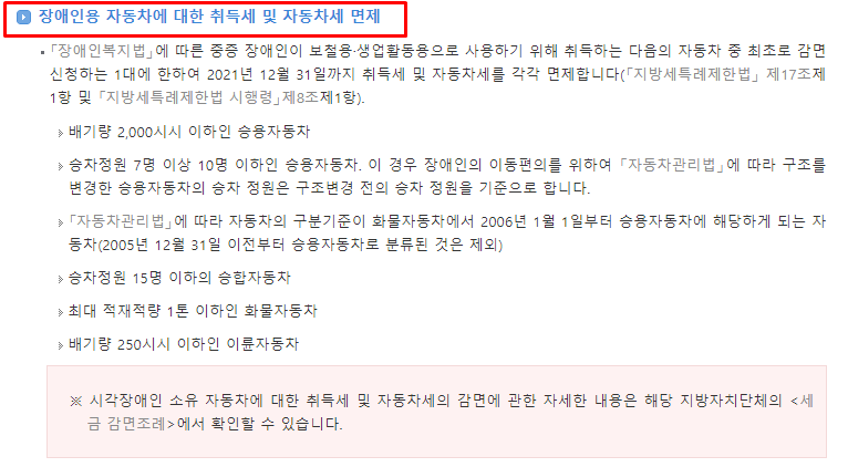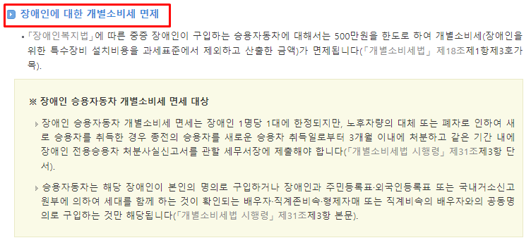 면세내역으로는 개별소비세와 지방세 두가지를 면제받을 수 있는데요. 면세대상과 면세범위, 내용 등 장애인 차량 구입조건이 자세히 나와있으니 잘 읽어보세요.