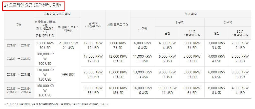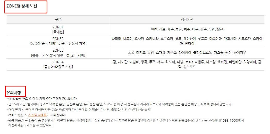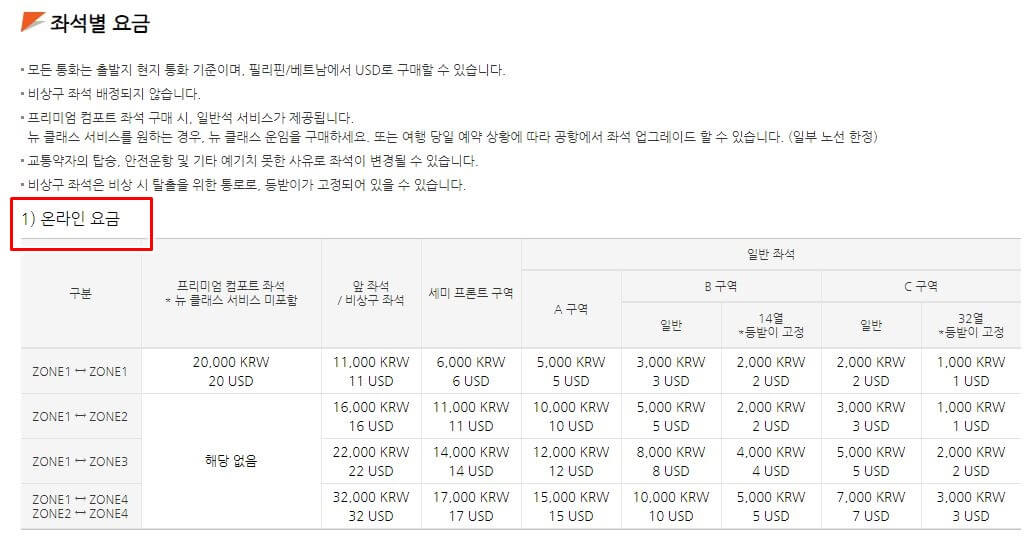 다만 좌석별로 금액이 다르기 때문에 미리 확인해주시는게 좋습니다. 자세한 좌석별 요금은 위 표를 참고해주시면 될거 같습니다. zone별 상세 노선이 구분되어 있습니다.