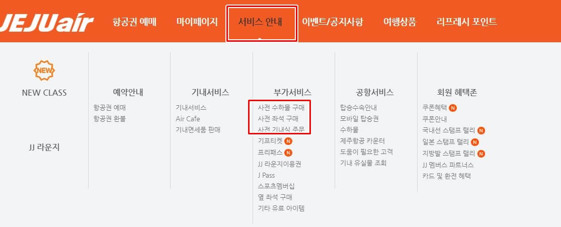 여기서 예약사항 및 좌석지정이 가능합니다. 홈페이지를 들어가 보면 서비스 안내 메뉴가 있습니다. 거기서 부가서비스 부분에 있는 사전 좌석 구매 버튼을 눌러주세요.