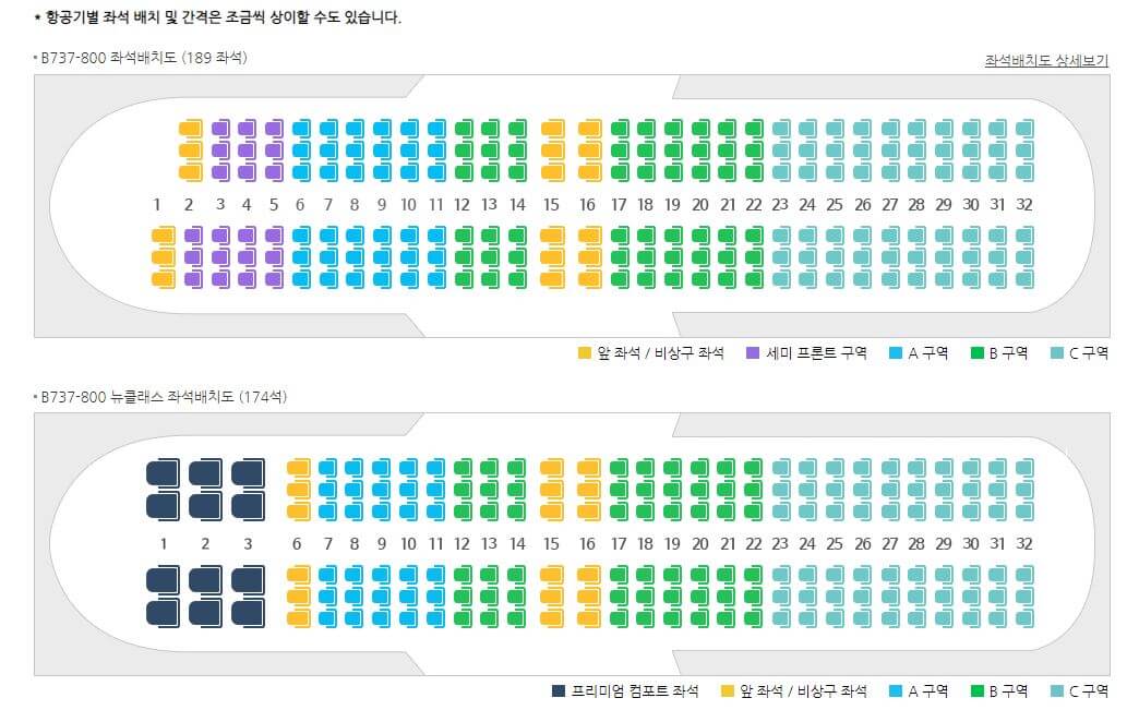 좌석은 앞좌석과 비상구, 일반, 선택불가 좌석으로 나뉘어져 있는데요. 이 중 인기가 많은건 단연 1열 앞좌석입니다.