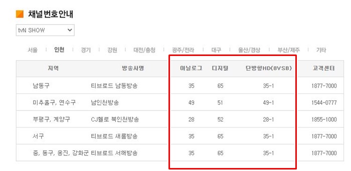 예를들어 인천 지역을 선택해 보면 남동구,미추홀구,부평구,서구지역 모두 번호가 다른것을 확인할 수 있습니다. 자신이 살고 있는지역을 선택하셔서 채널 번호를 확인하시면 되겠습니다.