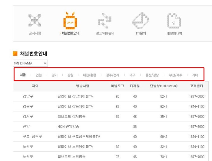 사진과 같이 각 지역별로 아날로그 디지털 단방향hd 별 채널번호를 확인할 수 있습니다.