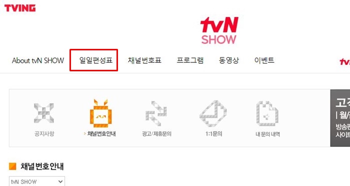 마찬가지로 홈페이지에 접속을 해보시면 상단 카테고리에 채널번호표가 있습니다. 항목을 클릭해 줍니다.
