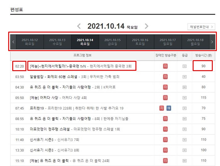 해당 항목을 선택하셨다면 각 요일별로 프로그램들이 나오는데요. 좌측에 시간 그리고 프로그램 제목 장애인 방송구분 등급 방송시간이 자세하게 나와있습니다. 여기서 자신이 원하는 프로그램 시간 정보를 확인하시고 즐겁게 tv를 시청하시면 되겠습니다.