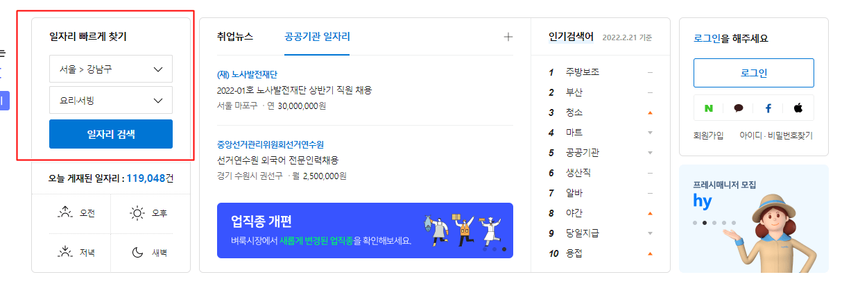 앞서 소개해드린 링크를 홈페이지를 접속하시면 구인구직 카테고리를 클릭합니다.