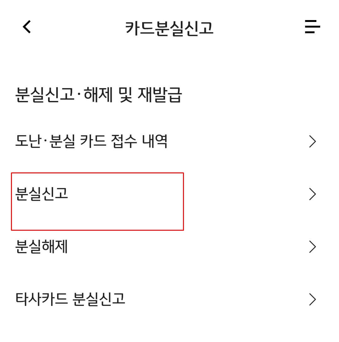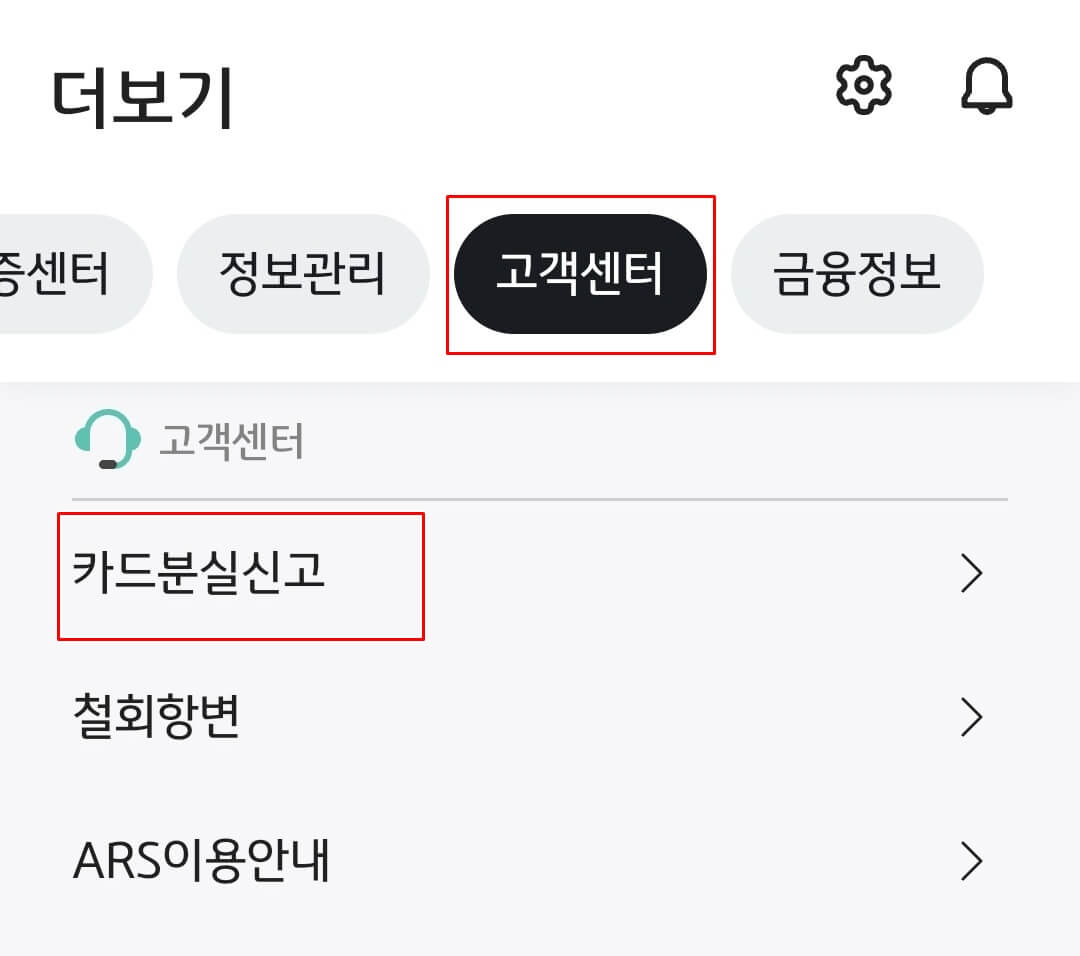 우측 상단 메뉴 -> 고객센터 -> 카드 분실신고를 통해서 신고가 가능합니다.