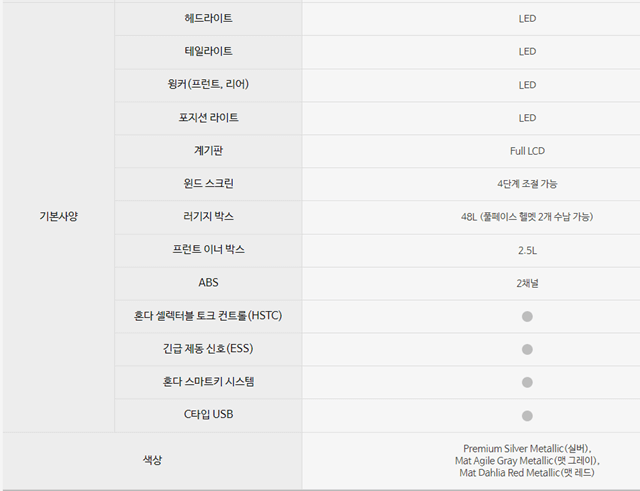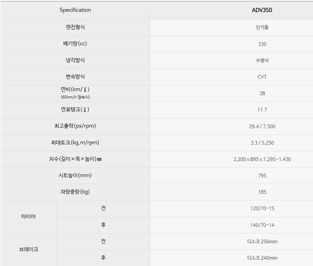 ADV350의 제원은 위 사진을 보시고 참고하시면 좋겠습니다.