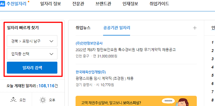 홈페이지에 접속을 하시면 일자리 빠르게 찾기 메뉴가 보이는데요. 여기서 지역을 선택 > 일자리 검색을 클릭합니다.