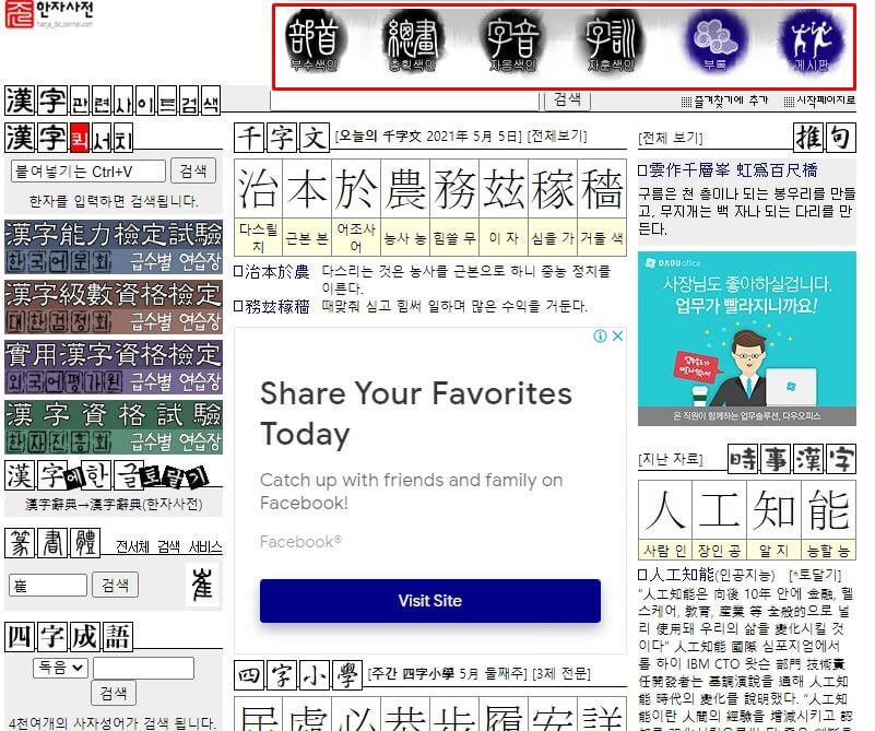 검색을 통해서 사이트를 쉽게 찾아볼 수 있습니다. 위 주소를 입력 후 접속하셔도 됩니다. 처음 접속 화면에서 부터 다양한 한자가 나오는걸 볼 수 있습니다.
